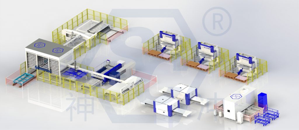 Entrepôt de matériaux → Laser → Tri → Unité de pliage → Soudage → Assemblage
